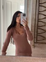 Sukienka o długości midi, wykonana z wysokiej jakości, elastycznej przędzy o prążkowanej strukturze. Model dekoltem karo i długimi rękawami doskonale podkreśla sylwetkę, zapewniając jednocześnie komfort noszenia. Subtelne rozcięcie z tyłu dodaje całości kobiecego charakteru i ułatwia swobodne poruszanie się. Idealna zarówno na co dzień, jak i na bardziej formalne okazje.