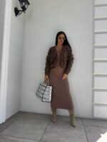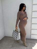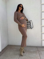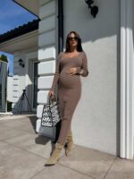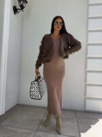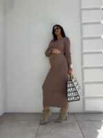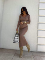 Sukienka o długości midi, wykonana z wysokiej jakości, elastycznej przędzy o prążkowanej strukturze. Model dekoltem karo i długimi rękawami doskonale podkreśla sylwetkę, zapewniając jednocześnie komfort noszenia. Subtelne rozcięcie z tyłu dodaje całości kobiecego charakteru i ułatwia swobodne poruszanie się. Idealna zarówno na co dzień, jak i na bardziej formalne okazje.
