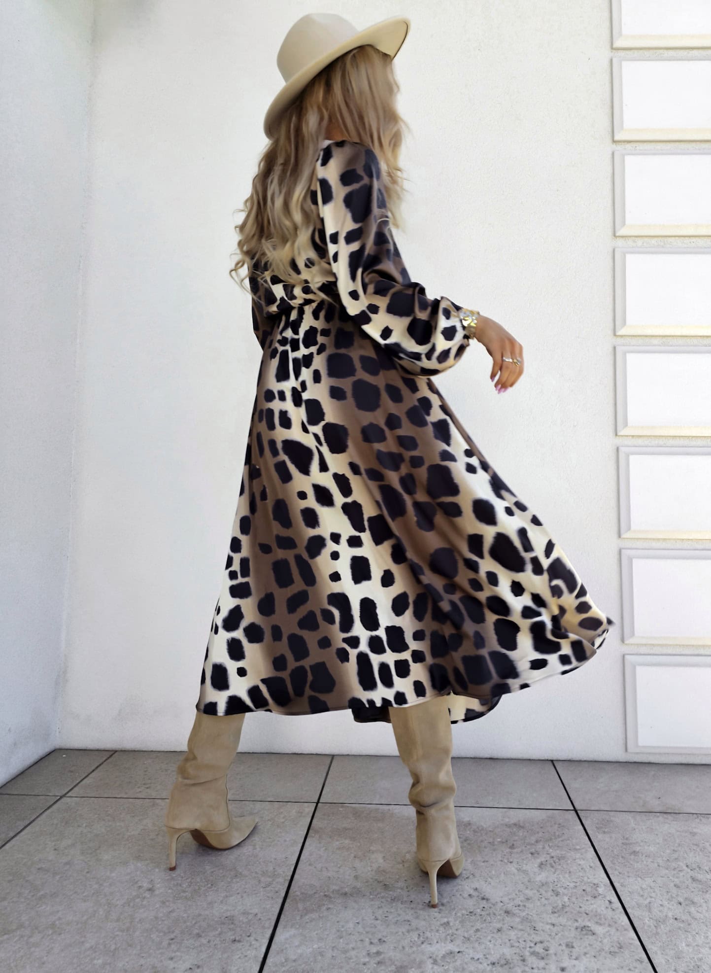 Sukienka Miranda to idealna propozycja na każdą porę roku. Posiada gumkę w pasie, gumki na rękawach. Nie rozchodzący się dekolt „V”. Zakładana przez głowę. Rozporek po lewej stronie.