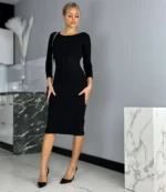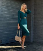 Dopasowana sukienka, prążkowany materiał. Można ją nosić na dwa sposoby. Z wycięciem z przodu lub na plecach.