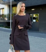 Na przodzie modne patki.Fason pięknie podkreśla kobiecą sylwetkę i dodaje elegancji. Sukienka idealna na wszelkiego typu imprezy okolicznościowe, spotkani w pracy, wieczorne wyjście.