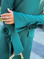 Elegancka sukienka rękawem ozdobionym kwiatem w kolorze sukienki. Model taliowany, na plecach zapinana na kryty zamek.