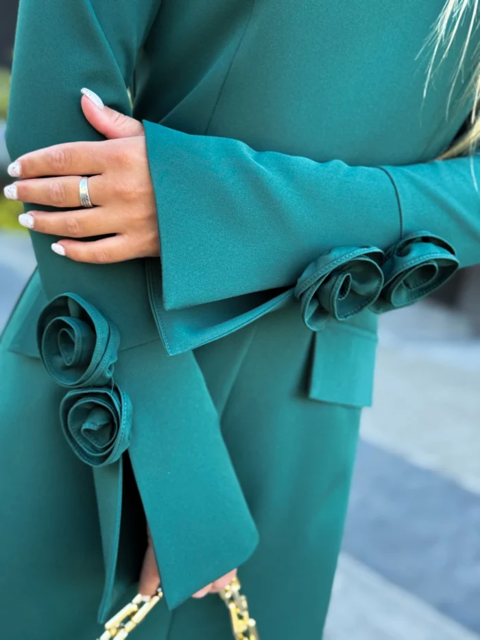 Elegancka sukienka rękawem ozdobionym kwiatem w kolorze sukienki. Model taliowany, na plecach zapinana na kryty zamek.