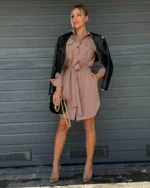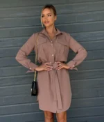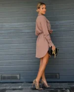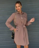 Sukienka szmizjerka o luźnym, koszulowym kroju, wykonana z wysokiej jakości bawełny. Model zapinany na guziki na całej długości, z bocznymi kieszeniami oraz paskiem w talii. Dodatkowo posiada imitacje kieszeni na piersi, a delikatne taliowanie na plecach subtelnie podkreśla sylwetkę.