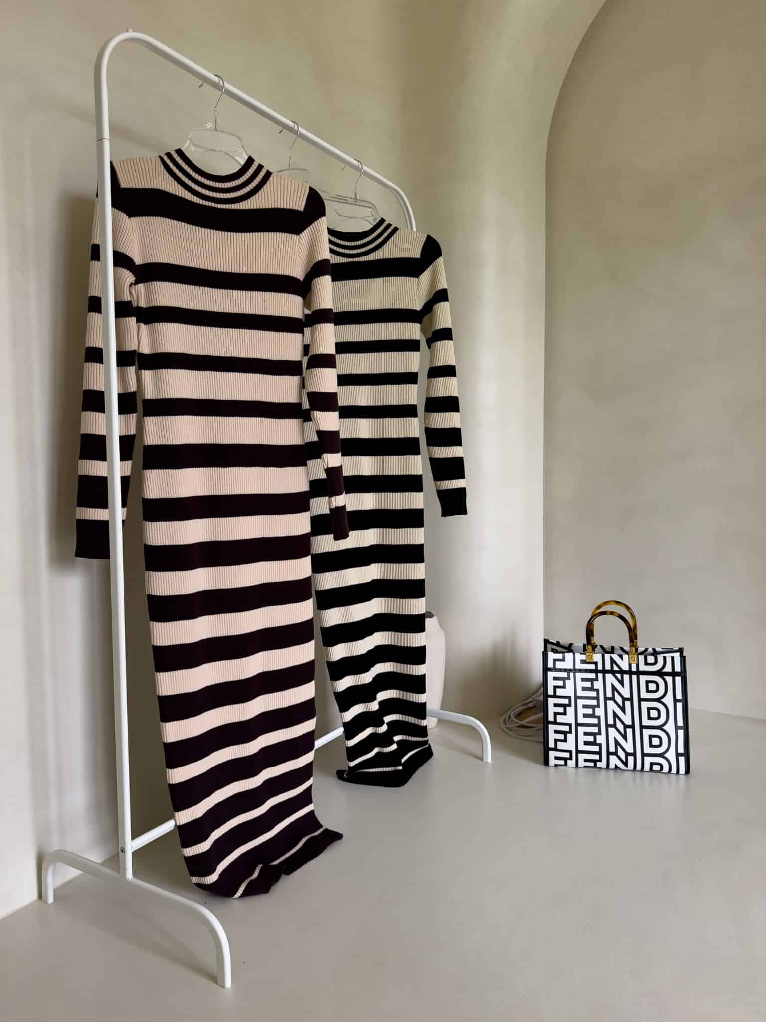 Dzianinowa sukienka, dopasowana w klasyczne poziome pasy. Na długi rękaw, sięga do kostek, co nadaje jej elegancki i minimalistyczny wygląd. Wzór pasków jest regularny, co optycznie podkreśla sylwetkę. Materiał prążkowany dzianinowy splot, który dobrze układa się na ciele.