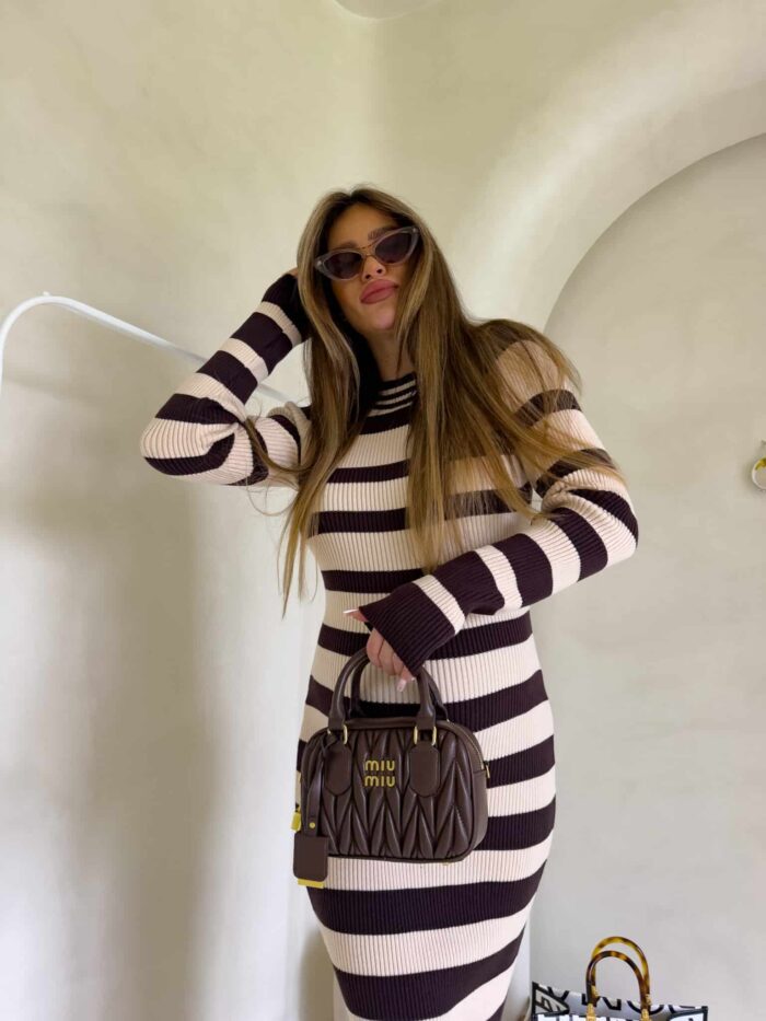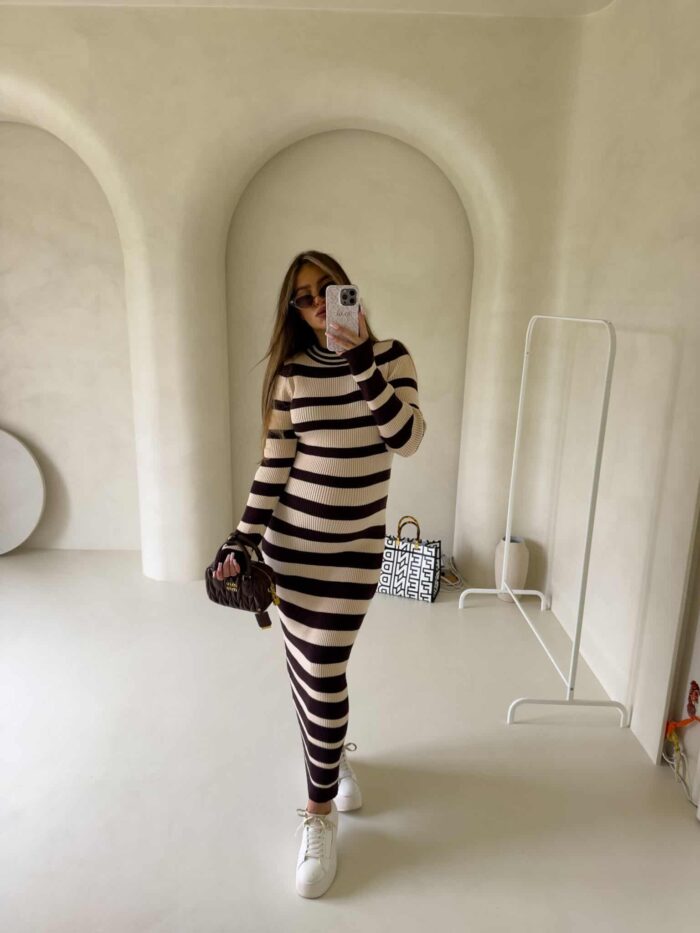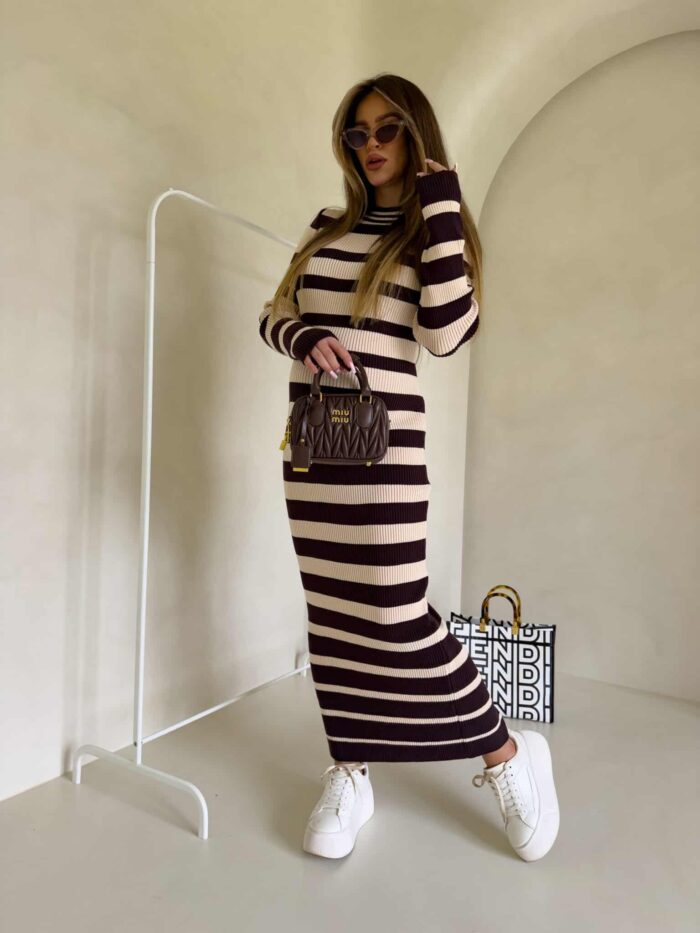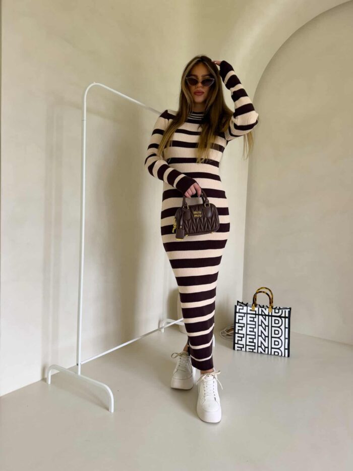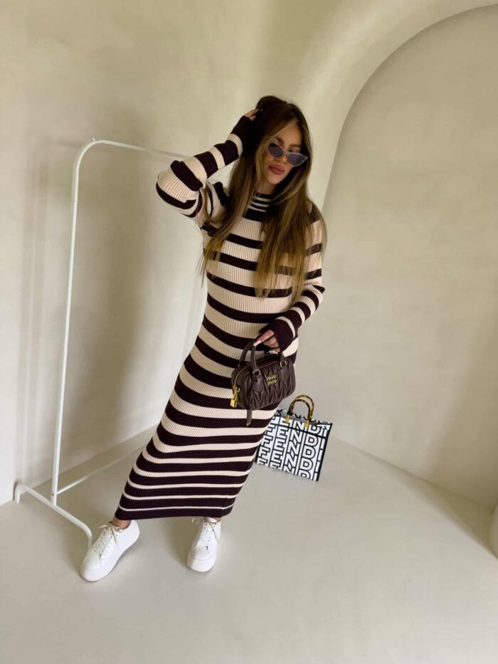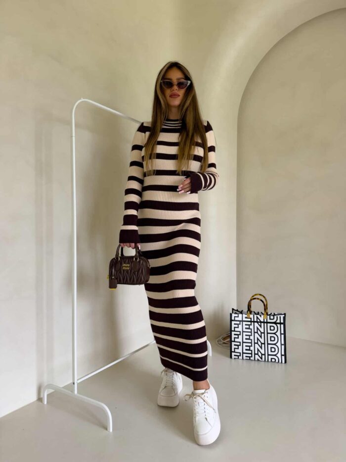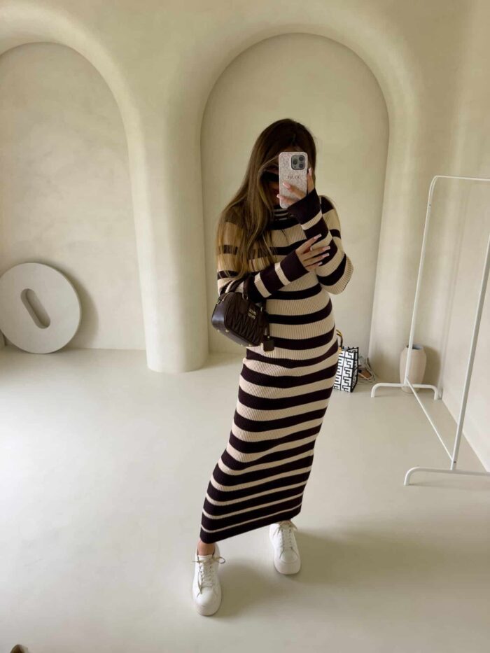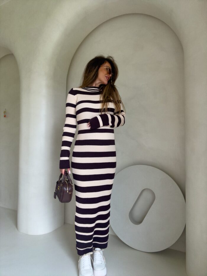 Dzianinowa sukienka, dopasowana w klasyczne poziome pasy. Na długi rękaw, sięga do kostek, co nadaje jej elegancki i minimalistyczny wygląd. Wzór pasków jest regularny, co optycznie podkreśla sylwetkę. Materiał prążkowany dzianinowy splot, który dobrze układa się na ciele.