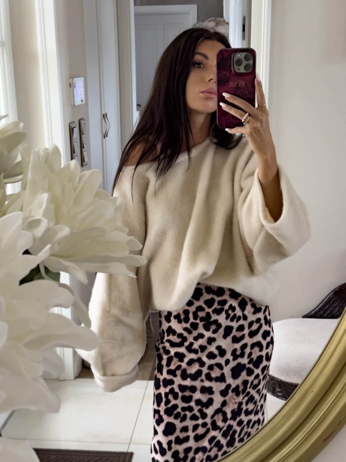 Sweter Alpaka to klasyczny sweterek typu OVERSIZE. Wykonany z tkaniny z włoskiem. Dla innego efektu rękaw można sobie pięknie wywinąć. Zakładany przez głowę.