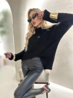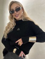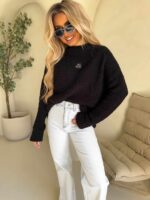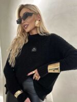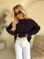 Sweter Bucla ma luźny, oversize’owy krój i jest wykonany z miękkiej, puszystej dzianiny. Posiada klasyczny, okrągły dekolt zakończony ściągaczem oraz długie rękawy, również wykończone szerokimi ściągaczami. Na przodzie, na wysokości klatki piersiowej, znajduje się mała, czarna naszywka z napisem „By Me” i delikatnym logo.