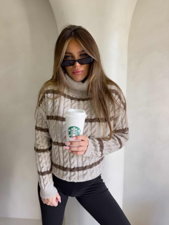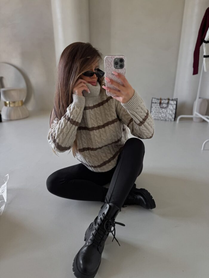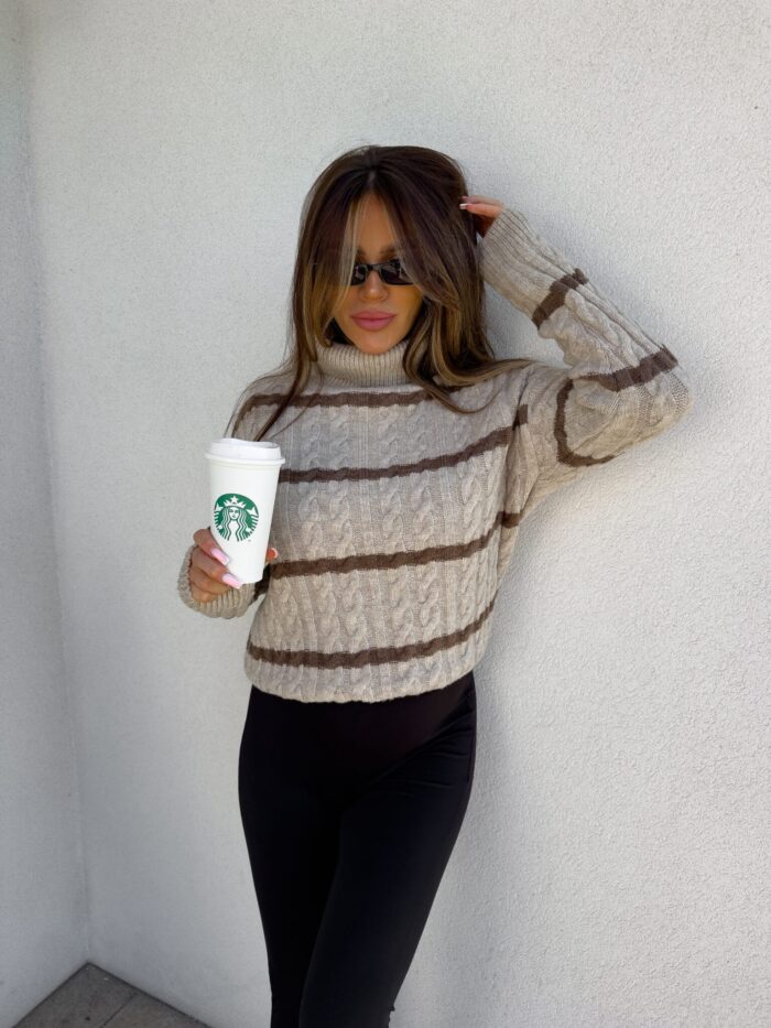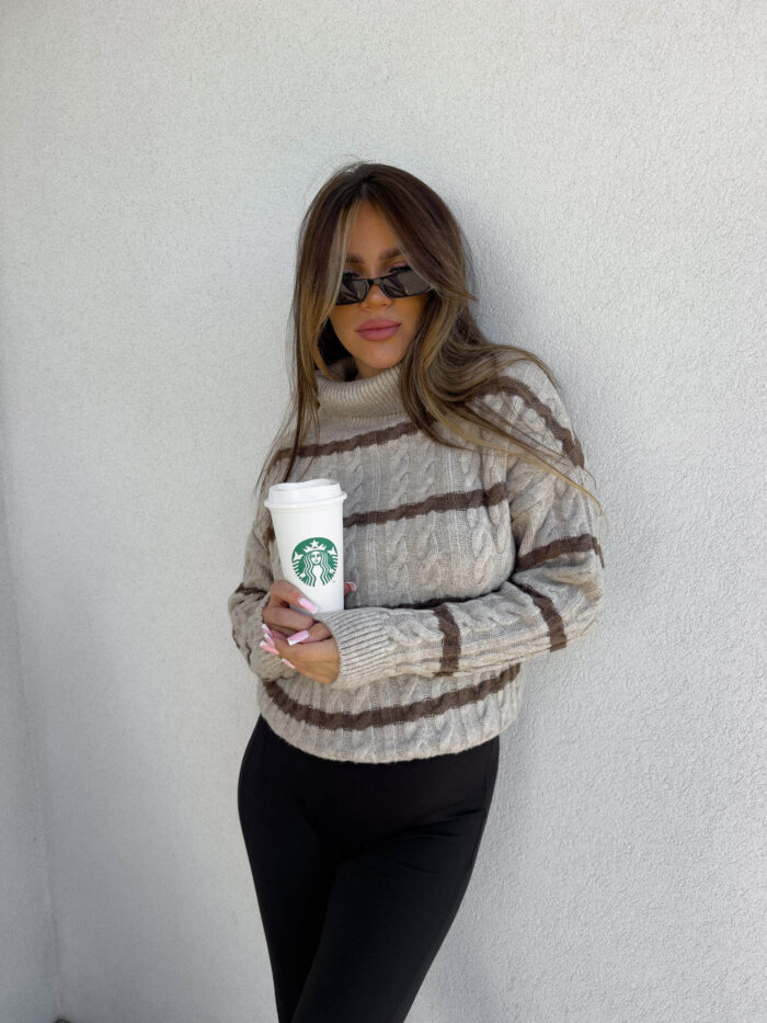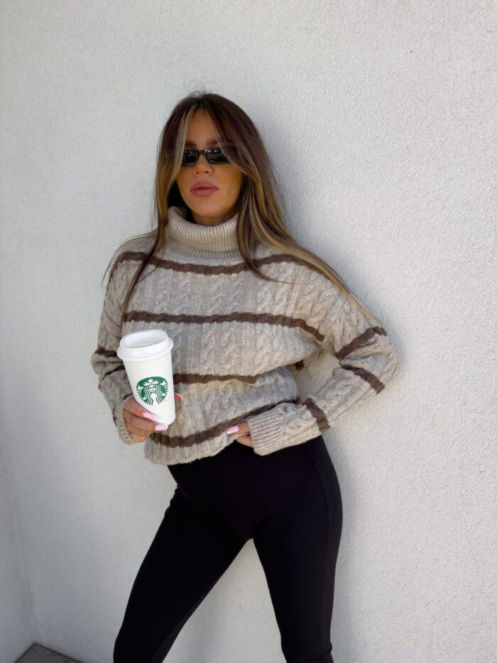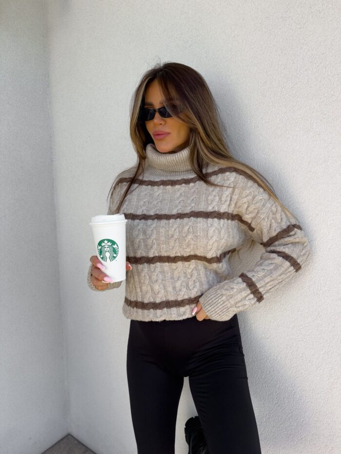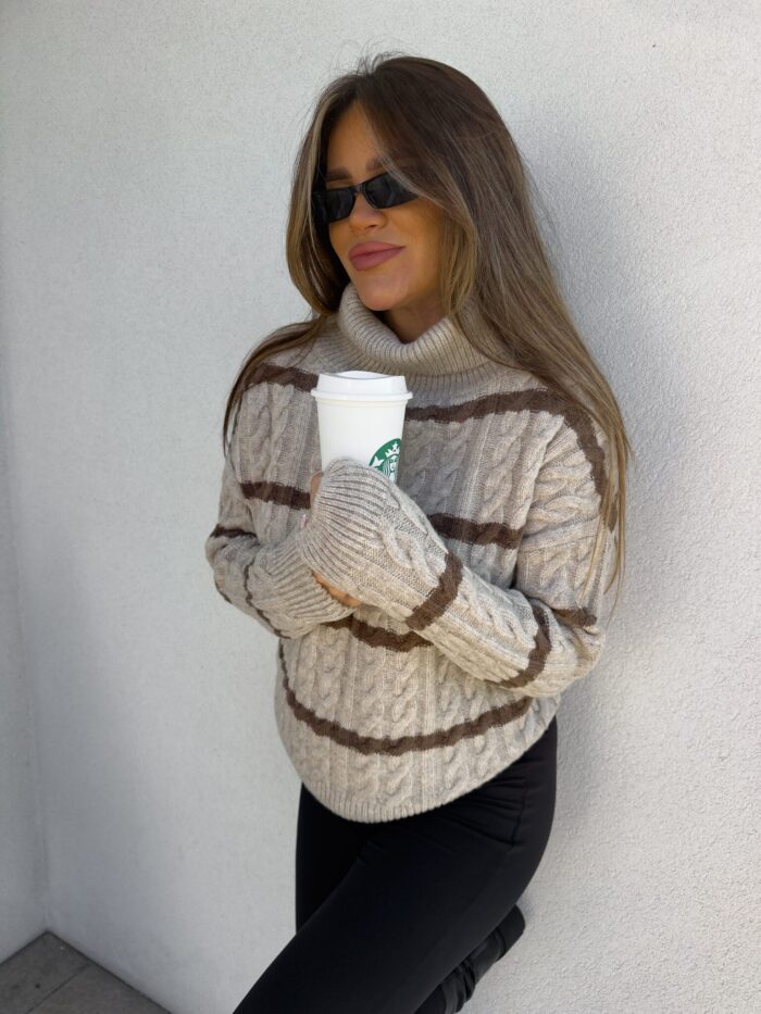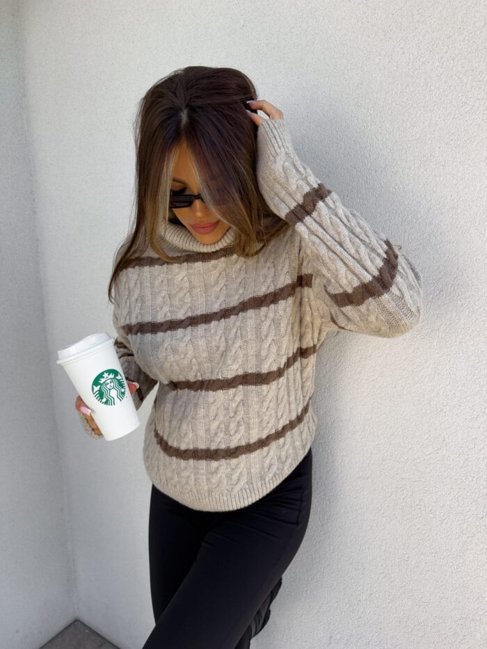 Sweter golf INKO pasy – beżowo-czekoladowe