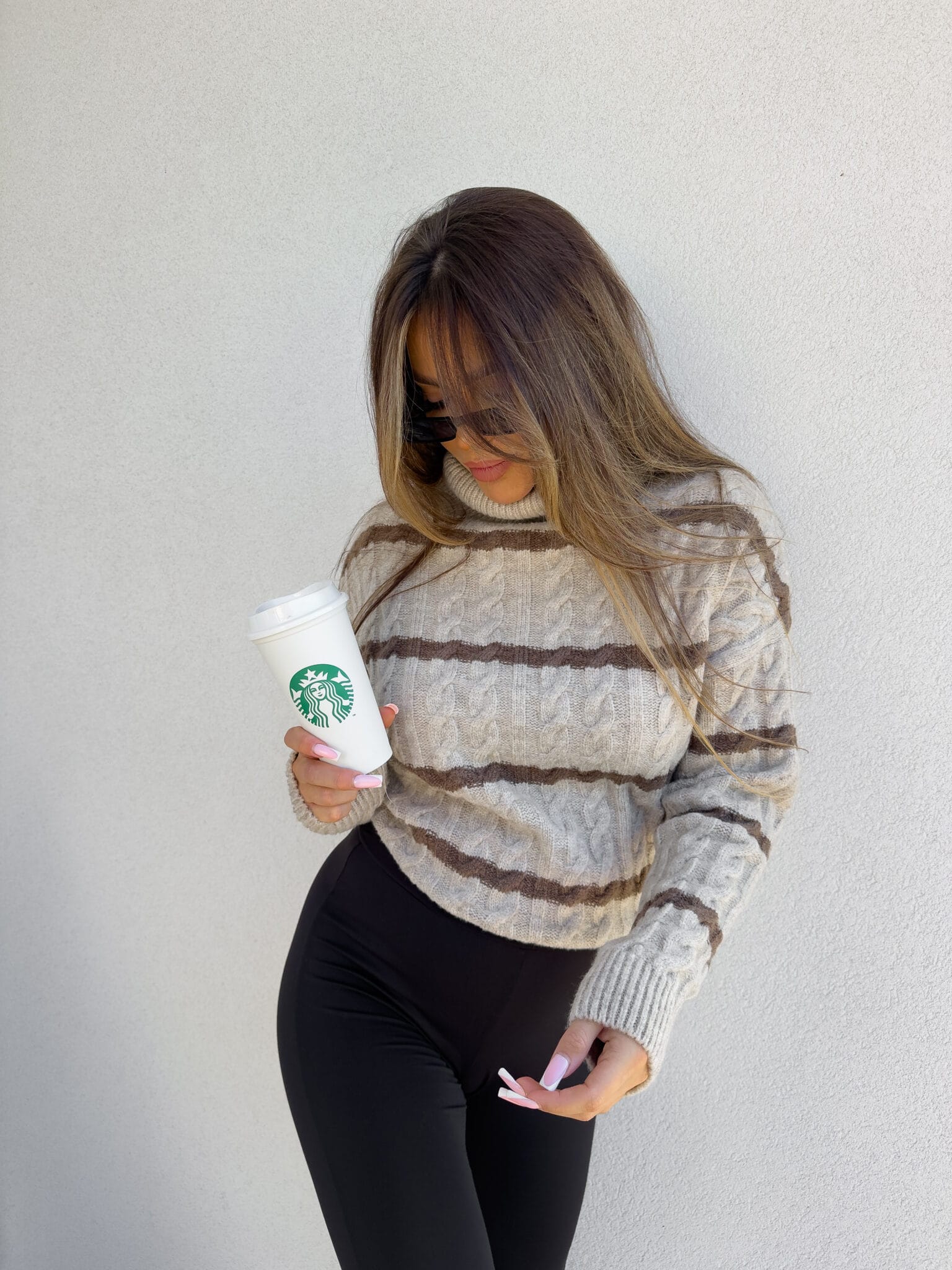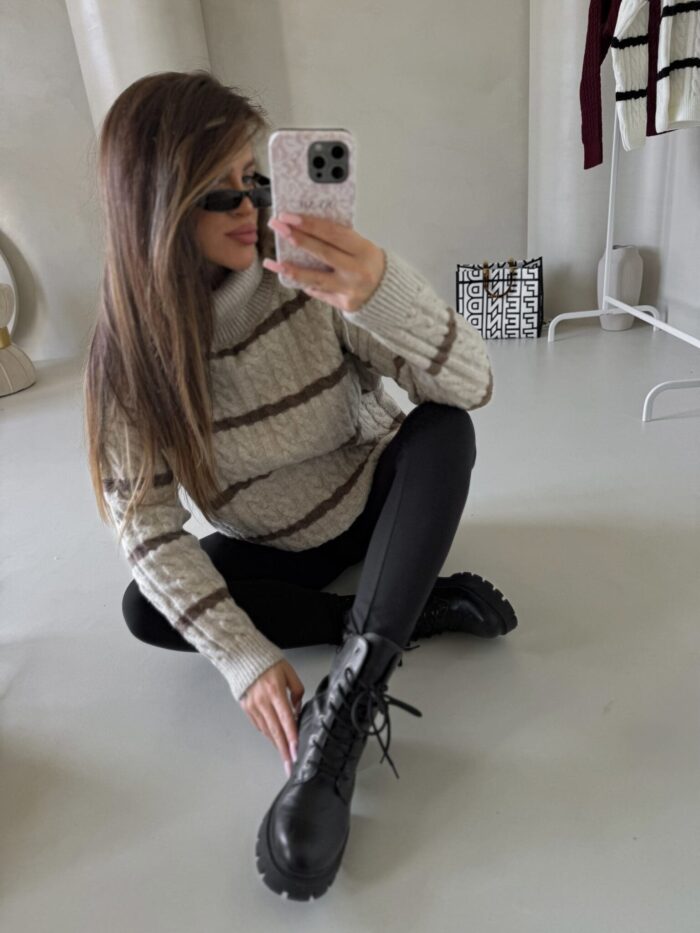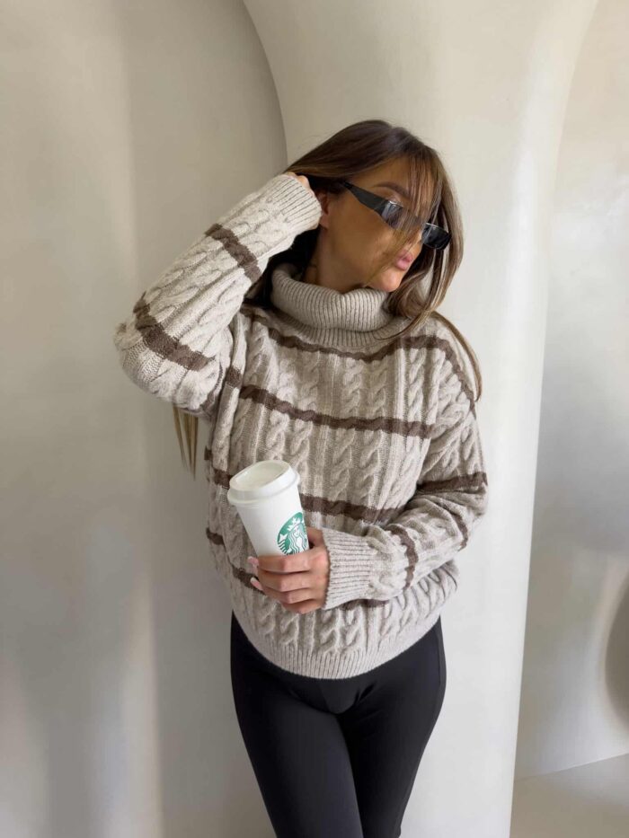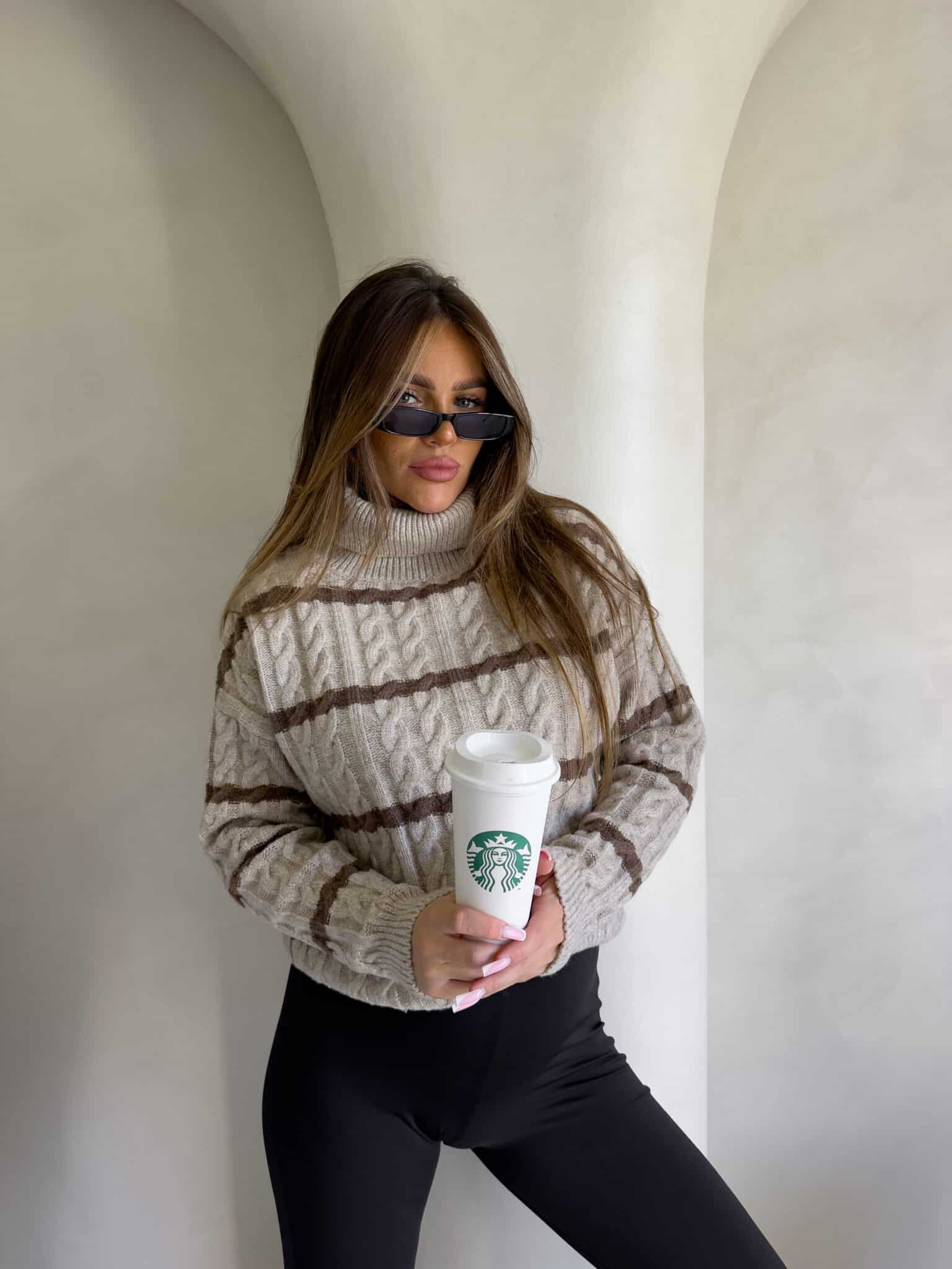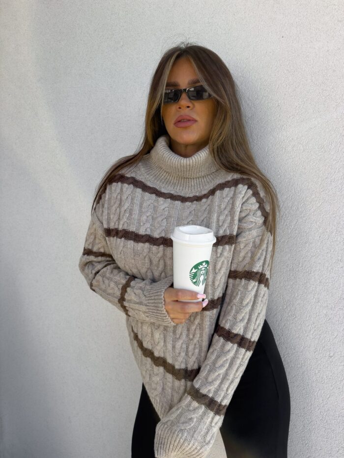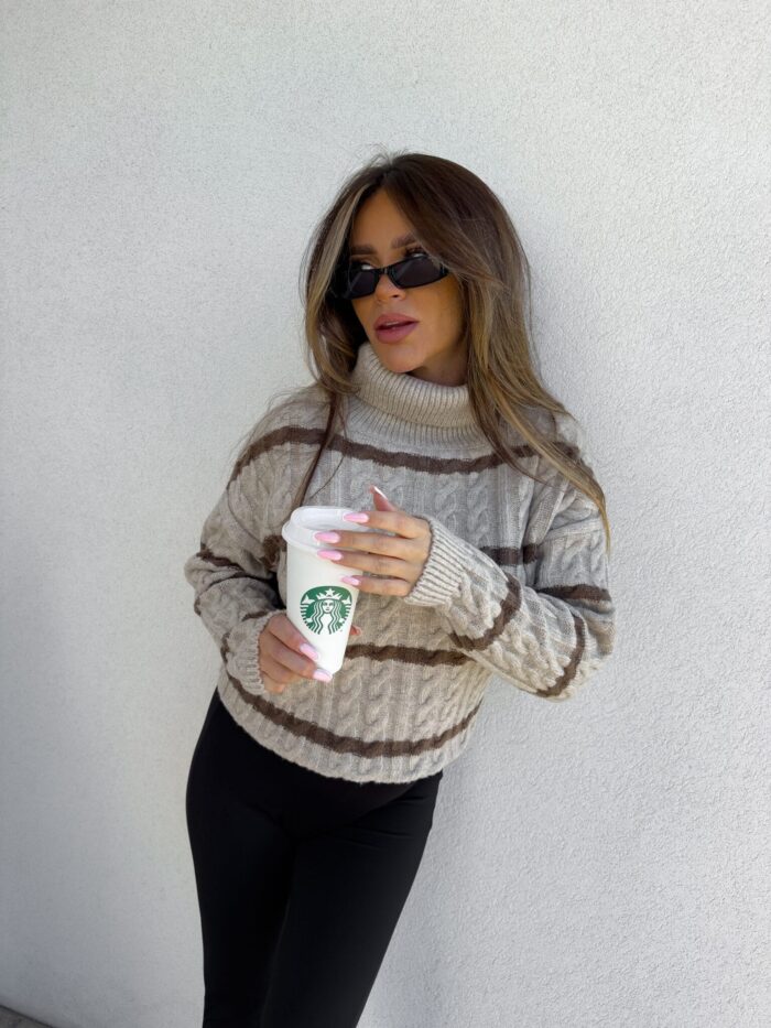 Sweter golf INKO pasy – beżowo-czekoladowe