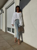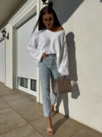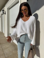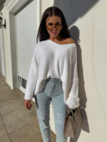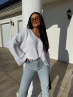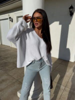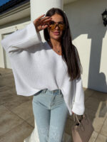 Sweter dzianinowy zakładany przez głowę, z długimi rękawami i dekoltem w serek to klasyczny wybór, który łączy elegancję z komfortem. Wykonany z miękkiej, elastycznej dzianiny, zapewnia wygodę przez cały dzień. Dekolt w serek dodaje lekkości i subtelnej kobiecości, podkreślając sylwetkę. Dzięki prostemu, ale ponadczasowemu krojowi, sweter ten doskonale sprawdzi się zarówno w casualowych, jak i bardziej eleganckich stylizacjach. Idealny do noszenia na co dzień, świetnie komponuje się z jeansami, spódnicą czy eleganckimi spodniami.