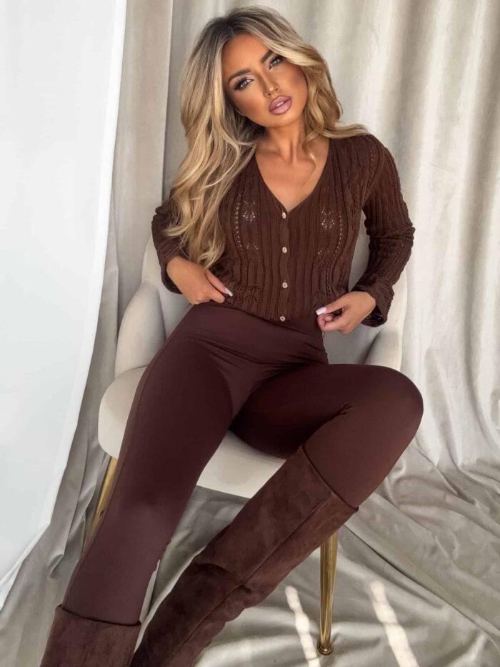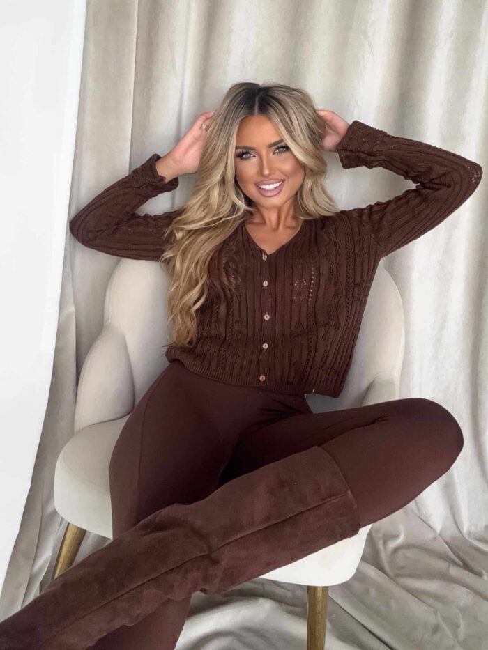 Ażurowy sweter z długim rękawem i dekoltem w serek. Wykonany jest z dzianiny o widocznym, strukturalnym splocie z delikatnymi ażurami, które nadają mu lekkości i kobiecego charakteru. Sweter zapinany jest na małe, drewniane guziki. Luźny krój oraz miękki materiał zapewniają komfort noszenia, a głęboki dekolt dodaje całości subtelnej zmysłowości. To doskonały element garderoby na wiosnę lub chłodniejsze letnie wieczory.