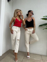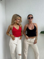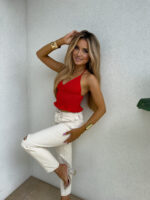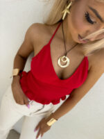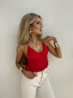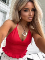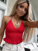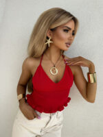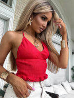 Top na cienkich ramiączkach, z wiązaniem na szyi, z dekoltem w kształcie litery V subtelnie podkreśla sylwetkę, a elastyczny, marszczony materiał zapewnia wygodę i dopasowanie do różnych figur. Dół bluzki ozdobiony jest delikatna falbanką.