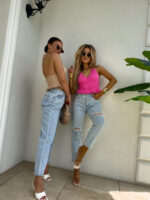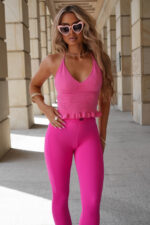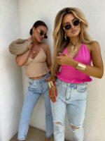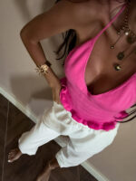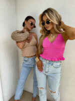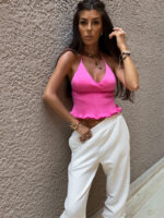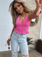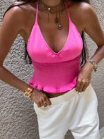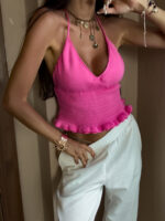Top na cienkich ramiączkach, z wiązaniem na szyi, z dekoltem w kształcie litery V subtelnie podkreśla sylwetkę, a elastyczny, marszczony materiał zapewnia wygodę i dopasowanie do różnych figur. Dół bluzki ozdobiony jest delikatna falbanką.