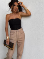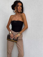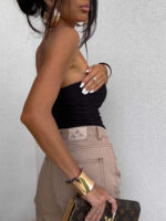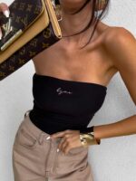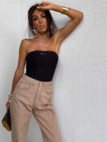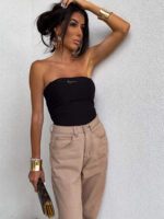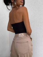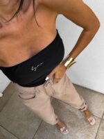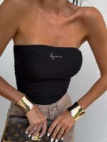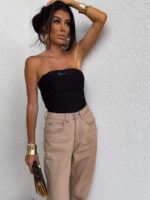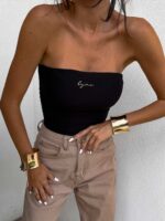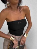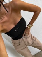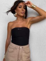 Top logowany bez ramiączek to idealna baza do wielu stylizacji – od codziennych po wieczorowe. Wykonany z elastycznego, idealnie dopasowującego się materiału, gwarantuje komfort noszenia i świetne dopasowanie do sylwetki. Top posiada podwójną warstwę materiału, co zapewnia lepsze krycie i trwałość, a subtelne marszczenia po bokach i z tyłu dodają mu charakteru i delikatnie modelują figurę. Uniwersalny krój sprawia, że będzie świetnie wyglądać zarówno solo, jak i w połączeniu z marynarką czy oversize’ową koszulą.