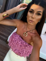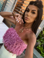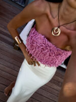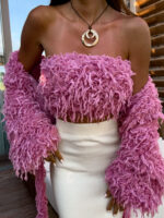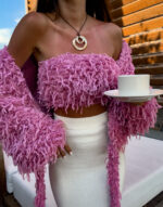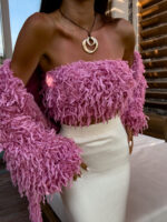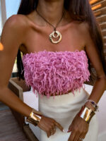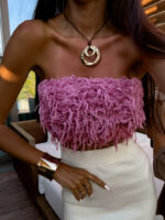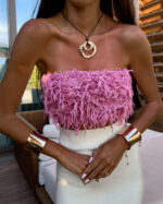 Ten wyjątkowy top bez ramiączek to must-have w każdej garderobie. Wykonany z niezwykle delikatnych, miękkich w dotyku „piórek”, doskonale dopasowuje się do ciała, zapewniając komfort noszenia przez cały dzień. Elastyczna gumka u góry i u dołu sprawia, że top idealnie dopasowuje się do sylwetki i utrzymuje na miejscu bez potrzeby ramiączek. Jego minimalistyczna forma i elegancka tekstura sprawiają, że świetnie sprawdzi się zarówno w codziennych, jak i bardziej wyjściowych stylizacjach. Noś go solo lub pod marynarkę, koszulę czy sweter – możliwości są nieograniczone.