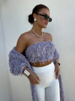 Ten wyjątkowy top bez ramiączek to must-have w każdej garderobie. Wykonany z niezwykle delikatnych, miękkich w dotyku „piórek”, doskonale dopasowuje się do ciała, zapewniając komfort noszenia przez cały dzień. Elastyczna gumka u góry i u dołu sprawia, że top idealnie dopasowuje się do sylwetki i utrzymuje na miejscu bez potrzeby ramiączek. Jego minimalistyczna forma i elegancka tekstura sprawiają, że świetnie sprawdzi się zarówno w codziennych, jak i bardziej wyjściowych stylizacjach. Noś go solo lub pod marynarkę, koszulę czy sweter – możliwości są nieograniczone.